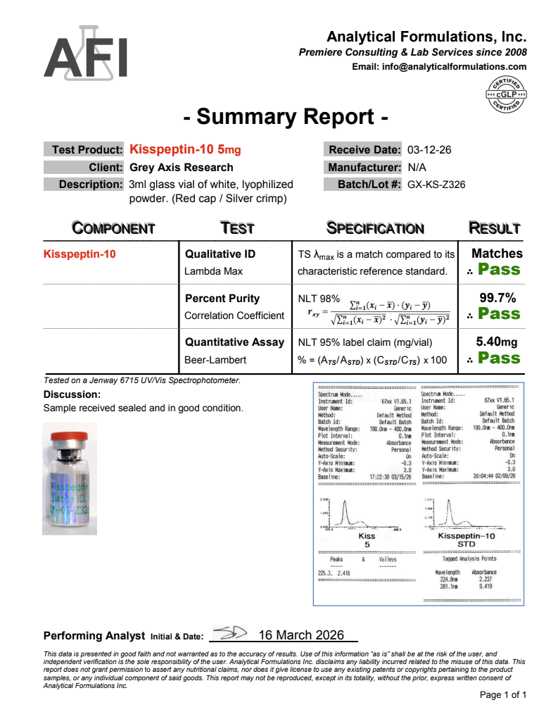Grey Axis Research, LLC does not provide guidance regarding reconstitution, handling, or laboratory procedures. All products are offered strictly for research use only in non-clinical settings and are not intended for human or animal use. These products have not undergone evaluation by the U.S. Food and Drug Administration.
